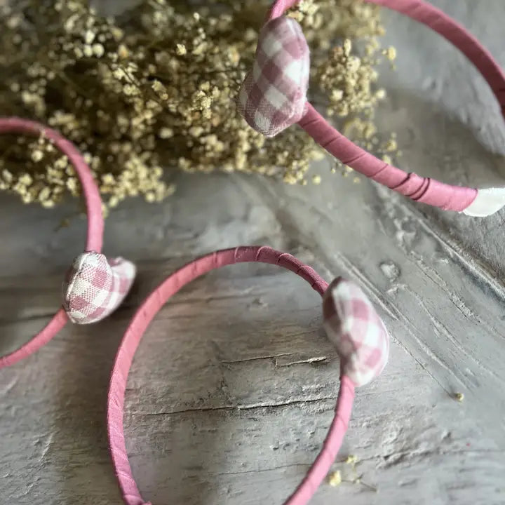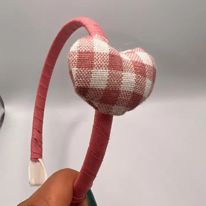 Delicato cerchietto in lino rosa fragola impreziosito da un cuore vichy che cattura lo sguardo. I nastri di velluto alle estremità garantiscono massimo comfort, eliminando qualsiasi fastidio dietro le orecchie durante il giorno. Perfetto per bambine a partire dai 3 anni, questo accessorio versatile si adatta a qualsiasi acconciatura e occasione. Con la sua larghezza di 1 cm e taglia unica, è il complemento ideale per aggiungere un tocco di dolcezza e stile al look della tua piccola.