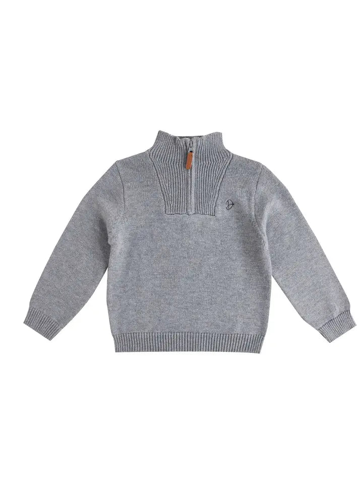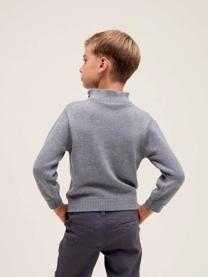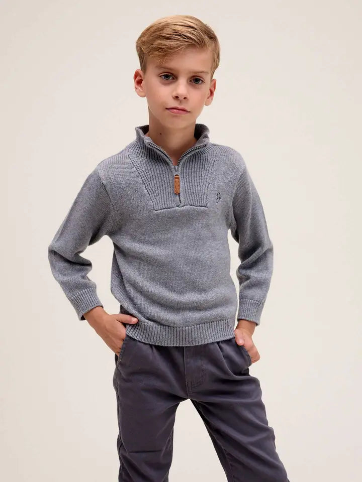 Maglioncino con cerniera grigio in maglia morbida, ideale per i tuoi bambini. Collo alto con zip pratica per un'indossabilità facile, maniche lunghe che garantiscono calore e protezione. Design moderno e versatile, perfetto per ogni occasione, dalla scuola al tempo libero. Comfort senza compromessi: la maglia avvolgente offre libertà di movimento mentre mantiene il tuo piccolo al caldo con eleganza. Un capo essenziale che combina praticità e stile, destinato a diventare il preferito del guardaroba invernale.