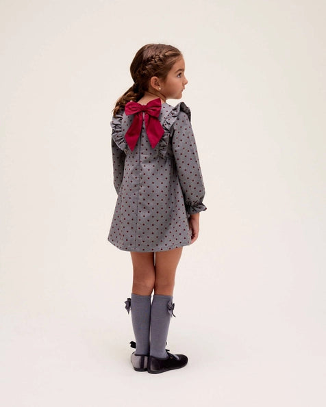 Questo adorabile abito svasato in grigio cattura l'essenza della dolcezza con dettagli in velluto bordeaux che lo rendono speciale. I cuoricini applicati donano un tocco romantico e affettuoso, perfetto per le occasioni importanti. Le maniche lunghe con polsino elastico garantiscono comfort e praticità, mentre i volant laterali sul davanti aggiungono movimento e grazia. Il fiocco bordeaux sulla schiena completa il design con eleganza, e la chiusura posteriore facilita l'indossamento. Un capo che unisce stile e funzionalità, ideale per far sentire speciale la tua bambina in ogni momento.