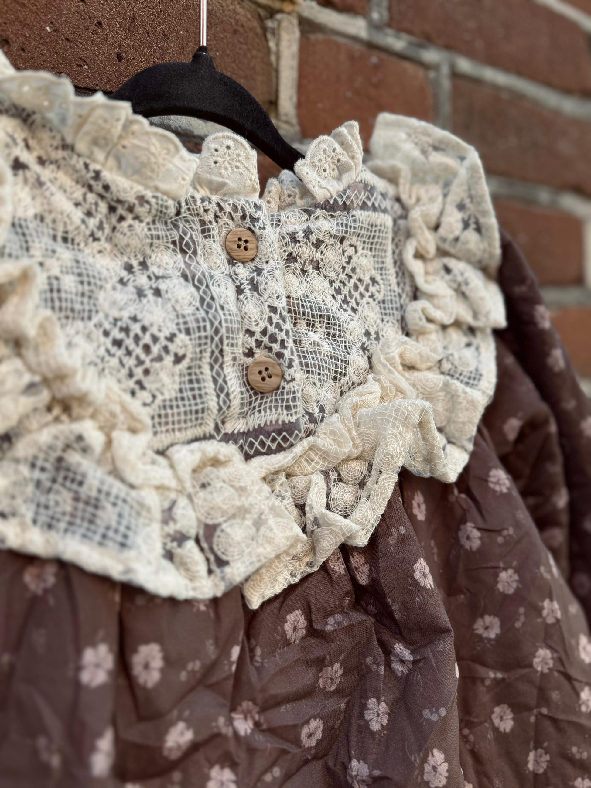 "Elegante Vestito Sky marrone per bambina, con collo in pizzo e dettagli bottoni in legno. Perfetto per tenere al caldo la tua piccola grazie all'imbottitura interna. Farà sentire la tua bambina come una principessa!"